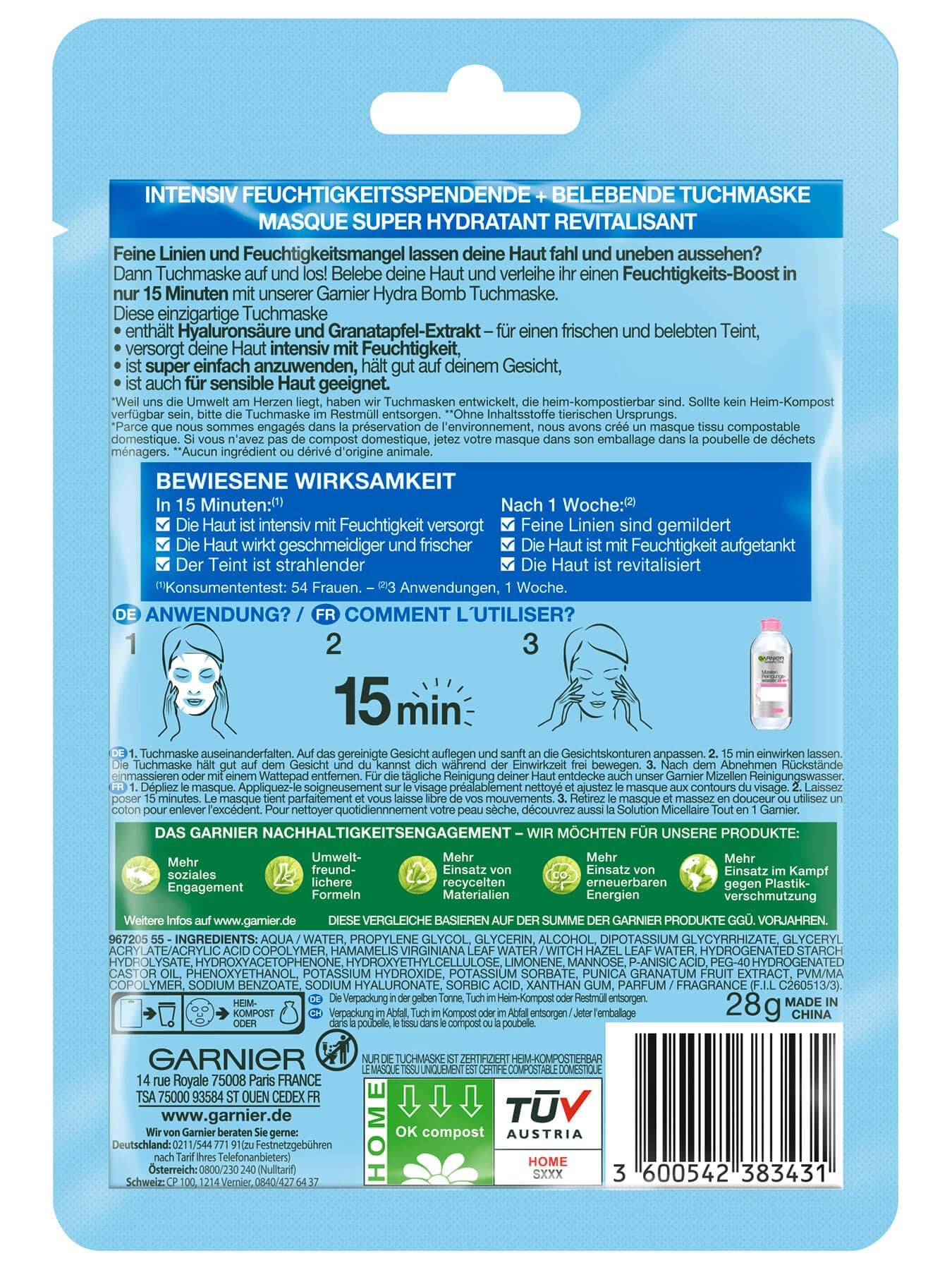 Inspiriert von asiatischen Beauty-Geheimnissen: Die Garnier SkinActive Hydra Bomb Tuchmaske aus Baumwollgewebe, getränkt mit Granatapfel, Hyaluronsäure und einem feuchtigkeitsspendendem Serum für feuchtigkeitsbedürftige Haut pflegt konzentriert und versorgt die dehydrierte Haut intensiv mit Feuchtigkeit und glättet feine Linien – für sofort spür- und sichtbare Ergebnisse und einen strahlenden Teint. Wie massgeschneidert passt sich die Tuchmaske jeder Gesichtskontur an. Mit natürlichen Inhaltsstoffen, Hyaluronsäure und einem feuchtigkeitsspendenden Serum sorgt sie für straffere Haut und einen strahlenden, gesund aussehenden Teint.