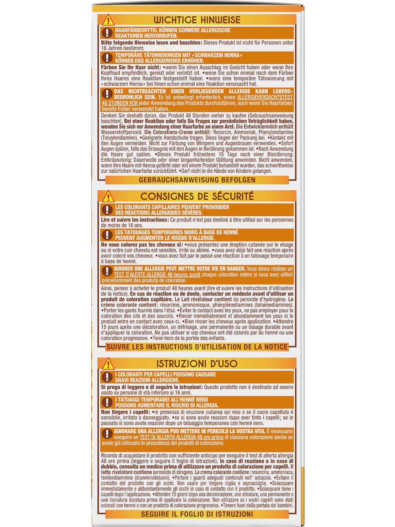 HAARFÄRBEMITTEL KÖNNEN SCHWERE ALLERGISCHE REAKTIONEN HERVORRUFEN. Bitte folgende Hinweise lesen und beachten: Dieses Produkt ist nicht für Personen unter 16 Jahren bestimmt. TEMPORÄRE TÄTOWIERUNGEN MIT „SCHWARZEM HENNA“ KÖNNEN DAS ALLERGIERISIKO ERHÖHEN. Färben Sie Ihr Haar nicht: Wenn Sie einen Ausschlag im Gesicht haben oder wenn Ihre Kopfhaut empfindlich, gereizt oder verletzt ist. Wenn Sie schon einmal nach dem Färben Ihres Haares eine Reaktion festgestellt haben. Wenn eine temporäre Tätowierung mit „schwarzem Henna“ bei Ihnen schon einmal eine Reaktion verursacht hat. DAS NICHTBEACHTEN EINER VORLIEGENDEN ALLERGIE KANN LEBENSBEDROHLICH SEIN. Es ist unbedingt erforderlich, einen ALLERGIEVERDACHTSTEST 48 STUNDEN VOR jeder Anwendung des Produkts durchzuführen, auch wenn Sie Haarfarben bereits früher verwendet haben. Denken Sie deshalb daran, das Produkt 48 Stunden vorher zu kaufen. (Gebrauchsanweisung beachten). Bei einer Reaktion oder falls Sie Fragen zur persönlichen Verträglichkeit haben, wenden Sie sich vor Anwendung einer Haarfarbe an einen Arzt. “Entwickler” enthält Wasserstoffperoxid. “Colorationsprodukt” enthält: Phenylendiamin, Resorcin, Phenylendiamine (Toluylendiamine), Ammoniak. Geeignete Handschuhe tragen. Diese liegen der Packung bei. Kontakt mit den Augen vermeiden. Nicht zur Färbung von Wimpern und Augenbrauen verwenden. Sofort Augen spülen, falls das Erzeugnis mit den Augen in Berührung gekommen ist. Nach Anwendung die Haare gut spülen. Dieses Produkt frühestens 15 Tage nach einer Entkräuselung, Dauerwelle oder einer langanhaltenden Glättung anwenden. Nicht anwenden, wenn Ihre Haare mit Henna gefärbt oder mit einem Produkt behandelt wurden, das schrittweise zur natürlichen Haarfarbe zurückführt. Darf nicht in die Hände von Kindern gelangen. GEBRAUCHSANWEISUNG BEFOLGEN.